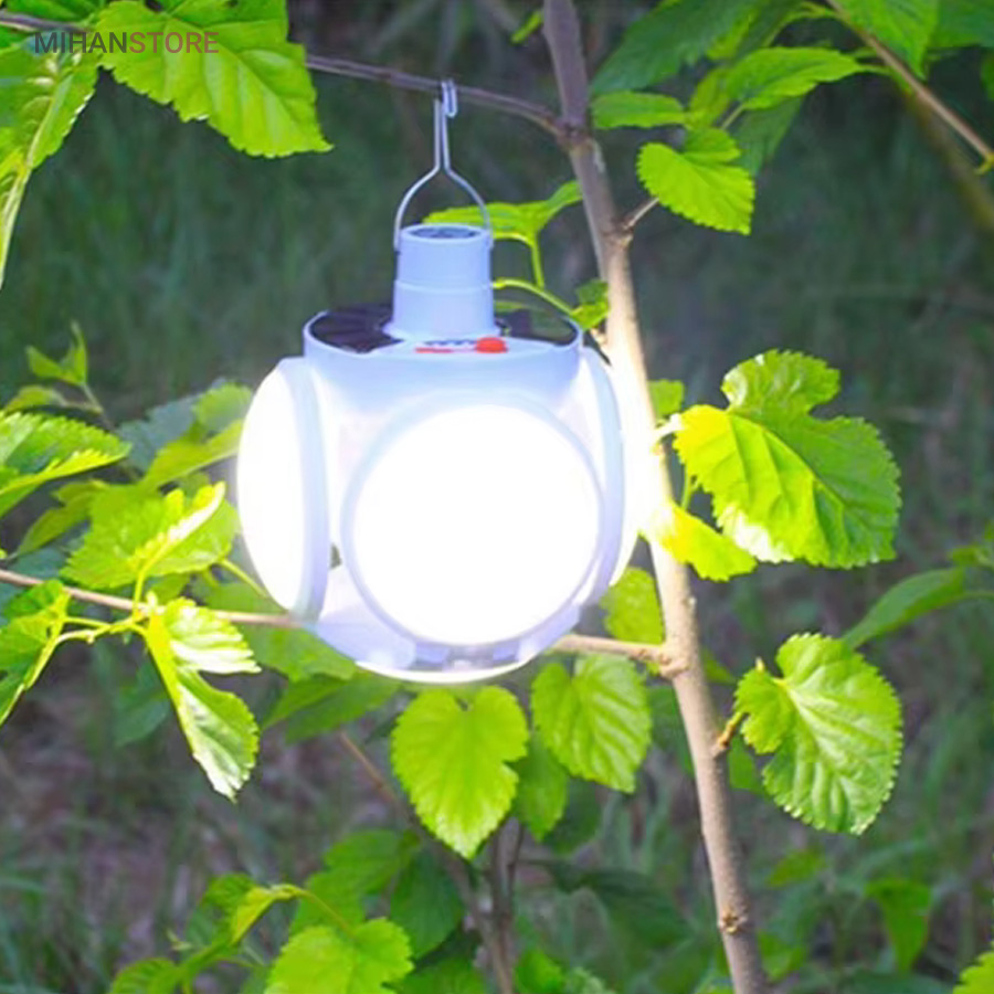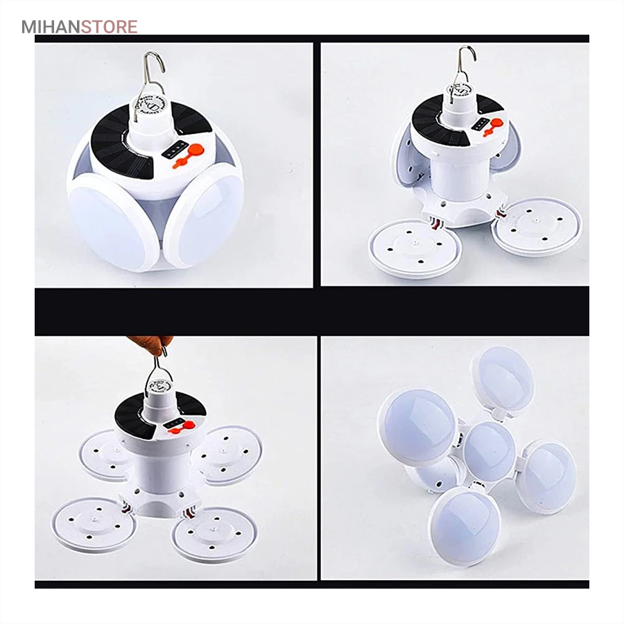 از ویژگی های دیگر این لامپ داشتن صفحه سولار می باشد و این خود می تواند بهترین کمک را در ذخیره انرژی داشته باشد، همچنین دارای میزان روشنایی 800 لومن و چراغ نشانگر شارژ در قسمت بالای لامپ نیز می باشد. منبع تغذیه لامپ توسط پنل خورشیدی و همچنین آداپتور می باشد. برای شارژ کامل لامپ، 5 ساعت زمان لازم است و با هر بار شارژ کامل، می توانید به مدت 6 تا 8 ساعت از نور آن استفاده کنید. باز شدن چهار ال ای دی این چراغ سولار زیبایی آن را دوچندان کرده است.سایز لامپ در حالت بسته (مدل توپ) 16x14x16 سانتیمتر میباشد در حالت سقفی باز 30x16x30 سانتیمتر می باشد.